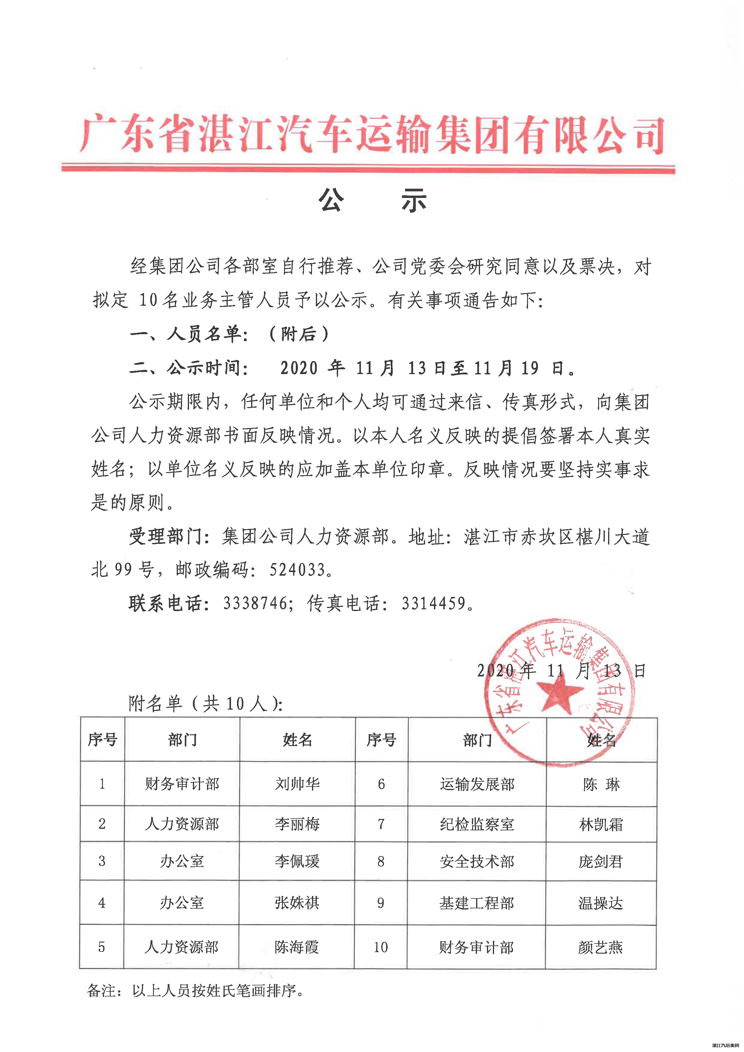 关于集团公司十名拟任业务主管的公示